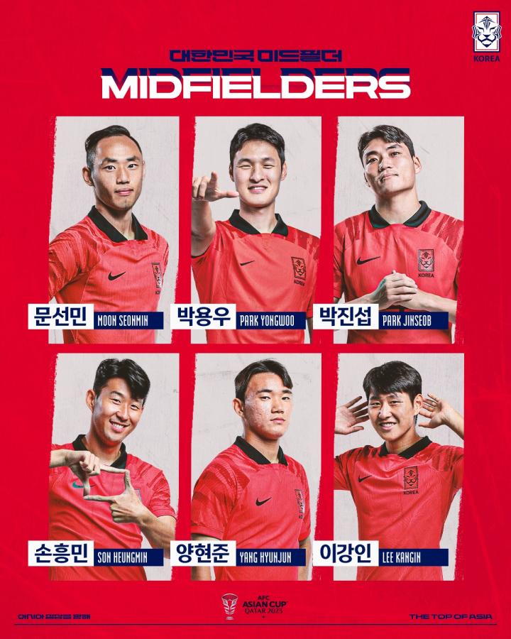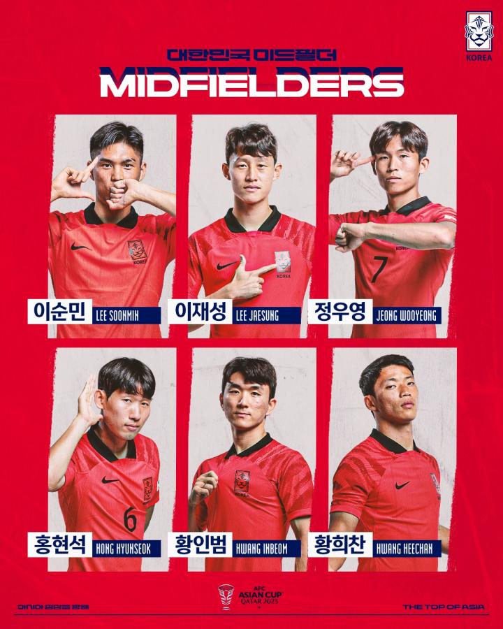中场:7-孙兴慜(托特纳姆热刺【英超】),18-李刚仁(巴黎圣日耳曼【法甲】),5-朴镕宇(艾因【阿联酋职】),10-李在城(美因茨【德甲】),8-洪铉锡(根特【比甲】),6-黄仁范(贝尔格莱德红星【塞超】),17-郑优营(斯图加特【德甲】),11-黄喜灿(狼【英超】),13-李淳敏(光州FC【K1】)14-文宣民、16-朴镇燮(全北现代汽车【K1】),26-梁铉浚(凯尔特人【苏超】)