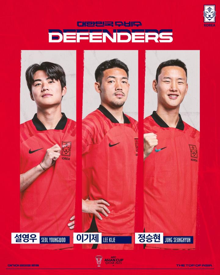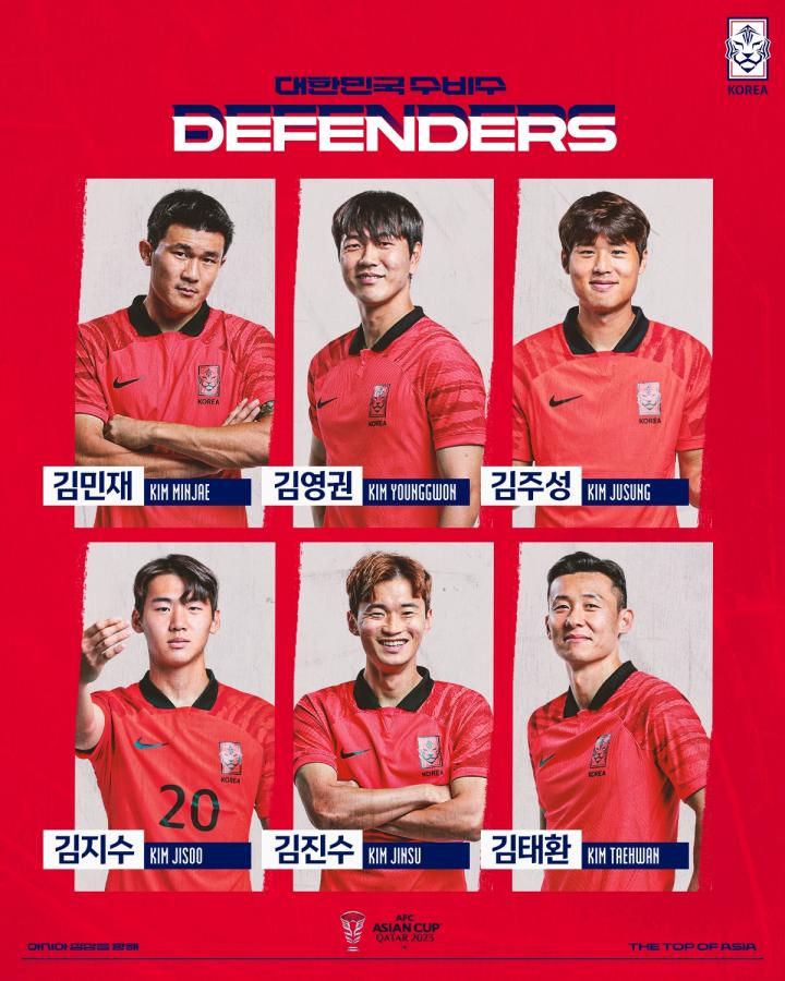 后卫:19-金英权、15-郑升炫、23-金太焕、22-薛英佑(蔚山HD FC【K1】),4-金玟哉(拜仁慕尼黑【德甲】),3-金珍洙(全北现代汽车【K1】),2-李记帝(水原三星蓝翼【K2】),24-金朱晟(FC首尔【K1】),25-金志树(布伦特福德【英超】)