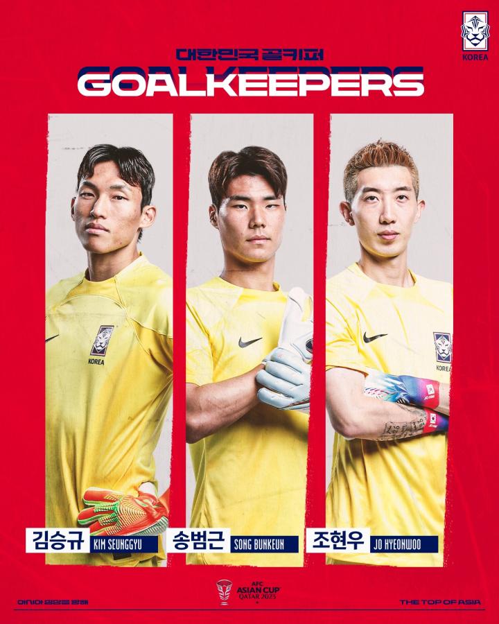 门将:1-金承奎(沙巴布【沙特职】),21-赵贤祐(蔚山HD FC【K1】),12-宋范根(湘南比马【J1】)