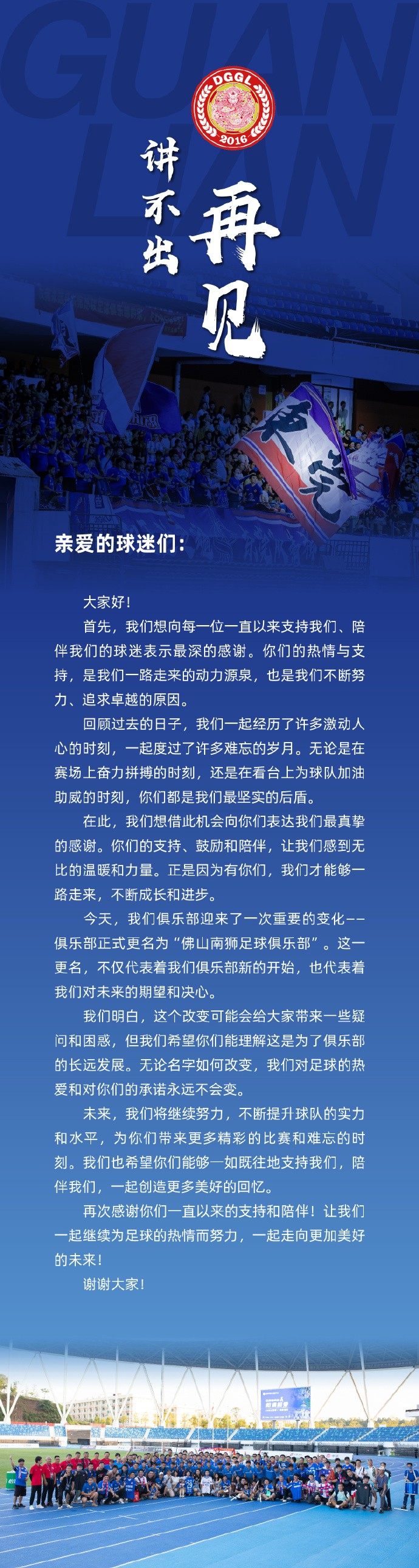 东莞莞联在更名为佛山南狮后,俱乐部发布了致球迷的一封信,向大家表示感谢。
