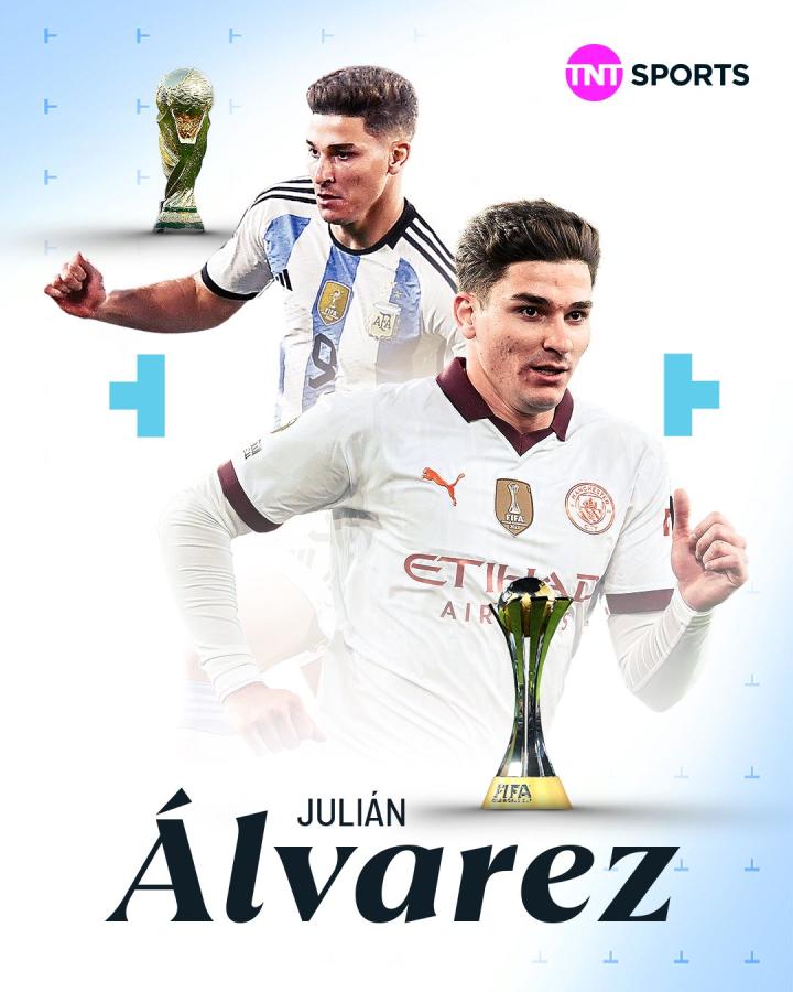世俱杯+世界杯,阿尔瓦雷斯是目前唯一穿着世界冠军徽章球衣参加俱乐部和国家队比赛的球员。