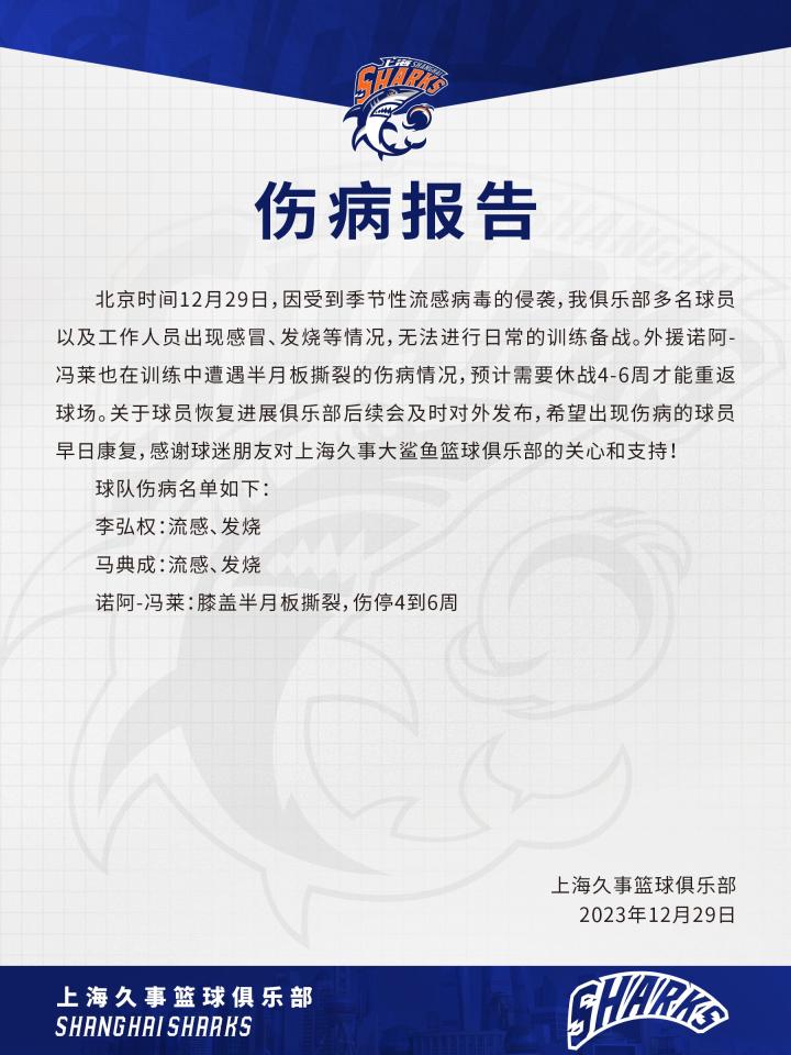 上海男篮外援诺阿-冯莱半月板撕裂,李弘权和马典成流感发烧凡尔赛小木屋 @懂球帝2023-12-29 18:5912月29日,上海男篮官方发布球员伤病报告,外援诺阿-冯莱半月板撕裂,预计休战4至6周,李弘权和马典成感染流感发烧。上海男篮官博写道:“目前球队多名球员及工作人员遭受伤病侵袭,关于球员恢复进展俱乐部后续会及时对外发布,希望有伤病的运动员及工作人员们早日康复。”今晚19时35分,CBA常规赛第23轮,上海男篮将对阵山东男篮。展开更多