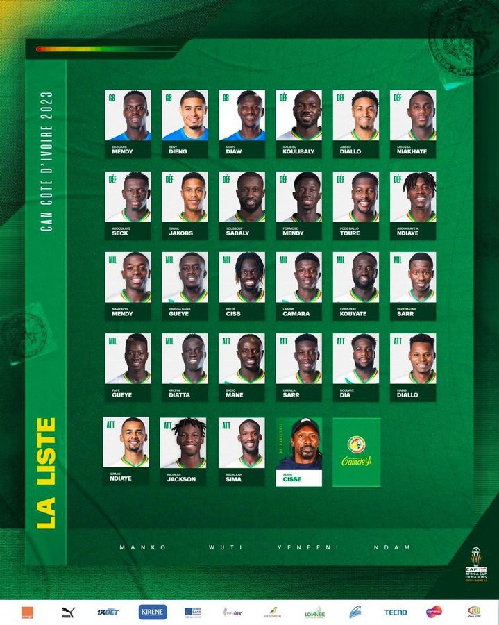 前锋:马内(利雅得胜利)、尼古拉斯-杰克逊(切尔西)、伊斯梅拉-萨尔(马赛)、布拉耶-迪亚(萨勒尼塔纳)、哈比卜-迪亚洛(利雅得青年人)、恩迪亚耶(马赛)、西马(格拉斯哥流浪者)