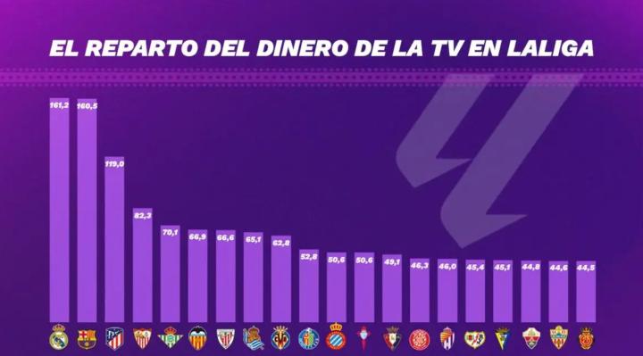 西甲上赛季电视转播分红较之前减少6千万欧,皇萨竞收益前三