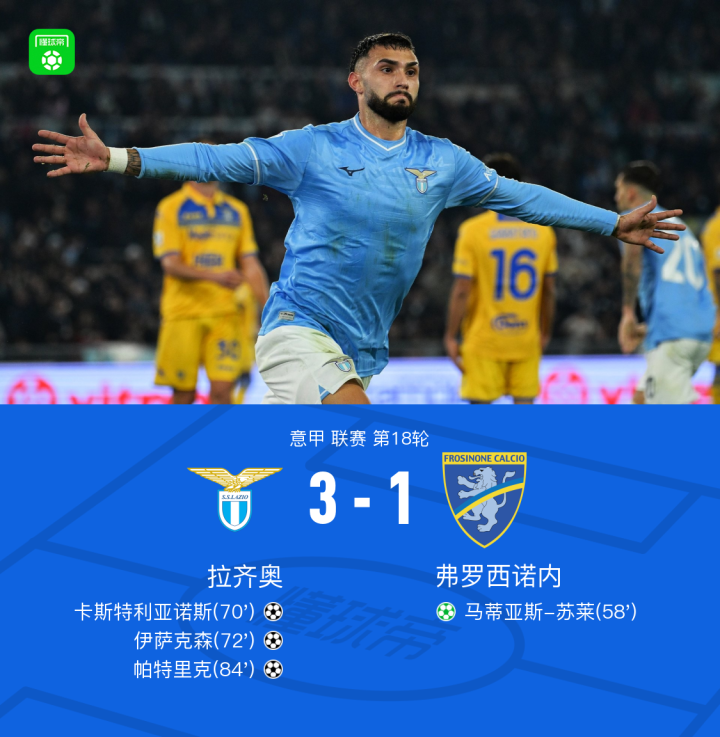 北京时间12月30日意甲 联赛 第18轮,拉齐奥主场对阵弗罗西诺内。上半场镰田大地远射打高,扎卡尼内切打门踢偏,下半场苏莱点射破门,卡斯特利亚诺斯头球扳平,伊萨克森低射破门,帕特里克后点抽射锁定胜局。最终拉齐奥3-1逆转获胜。