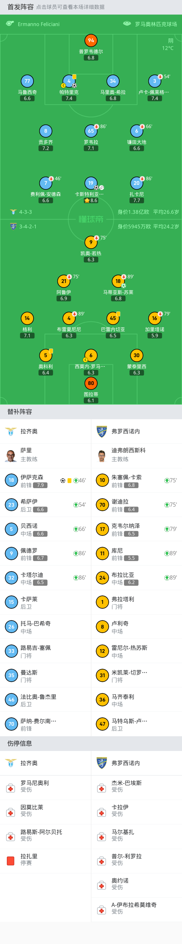 弗罗西诺内首发:6-西莫内-罗马尼奥利, 16-加里塔诺, 14-格利, 21-阿鲁伊, 80-图拉蒂, 4-布雷夏尼尼, 9-凯奥-若热, 5-奥科利, 45-巴雷内切亚, 30-蒙泰里西, 18-马蒂亚斯-苏莱