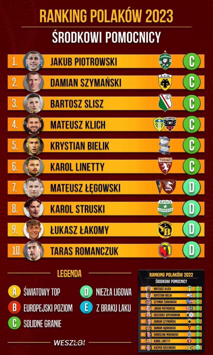 第五份榜单的评价对象是中场和防守型中场,这份名单看起来非常平淡,今年甚至没有一名波兰球员能够被评为B级。不再年轻的克雷霍维亚克落选了这份榜单,但在上榜的球员中,也没有人能够达到他当年的水平。