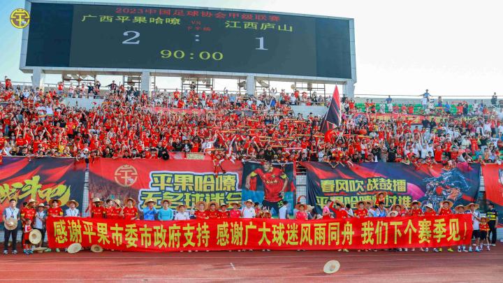 在2023赛季的中国足球协会甲级联赛中,广西平果哈嘹30轮比赛14胜12平4负进38球失20球,积54分排名中甲第四。安永佳以15个进球排名射手榜次席,再次创造了广西足球历史最好成绩。同时,平果主场也以场均15135人拿下中甲上座率第一,是广西足球里程碑式的又一个成就!