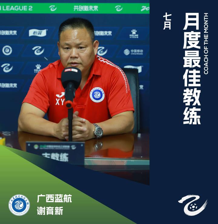 广西蓝航主教练谢育新被评为中乙7月最佳教练。周子恒在7月的5场联赛里,他场场都有进球,帮助球队获得了4胜1平的战绩,稳稳晋级冲甲组,被评为7月最佳球员。广西蓝航的9粒精彩进球入选中乙第1、2、4、5、10、12、13、14、19轮的五佳球。