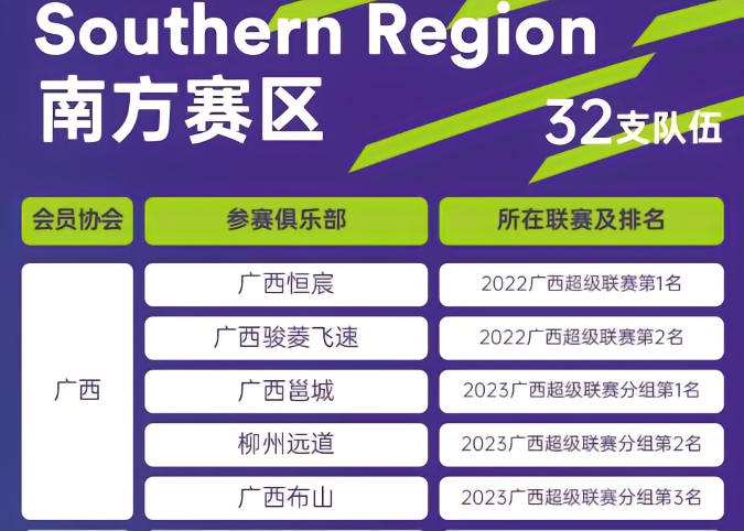 广西恒宸、广西邕城、柳州津晶远道、广西布山、广西骏菱飞速,5支桂超球队出战2023中冠大区赛。五支球队,年度总投入接近2000万,其中广西恒宸投入600万,广西邕城的投入500万,广西布山400万,柳州津晶远道300万,广西骏菱飞速200万。球队目标明确,计划完善,着力扎根社区和推动足球青训,都有较为长远的足球发展规划。另外,广西极驰也进入中冠大区赛的替补名单。一个省级单位6支球队备战大区赛也创造了中冠联赛的纪录。最终,广西恒宸冲乙成功。