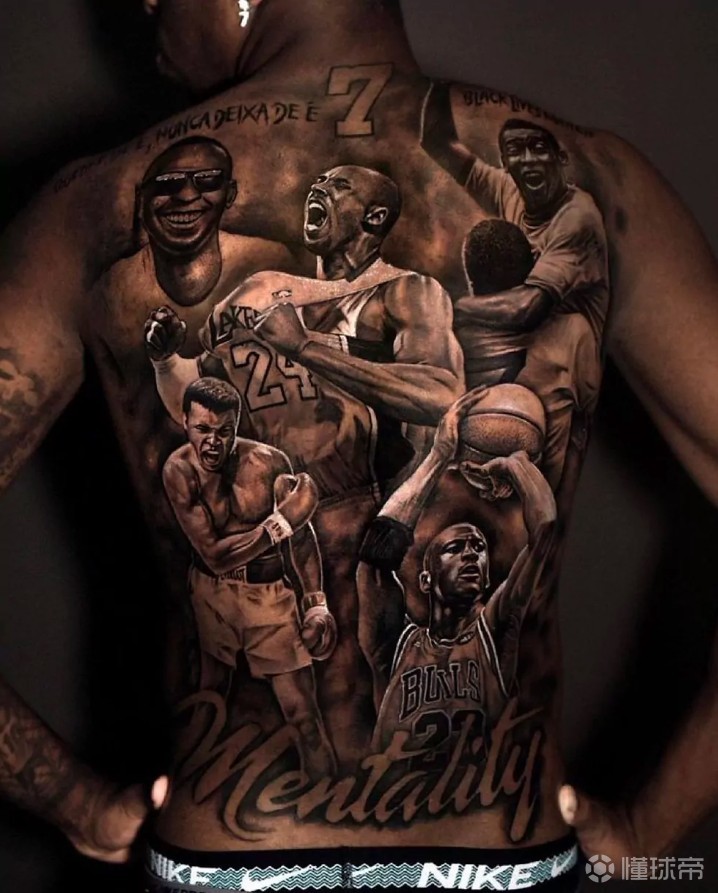 除了这些壮观的图像外,还写着“Mentality”(心态),号码7,右肩膀上写着的“Black lives matter”(黑人的命也是命)。