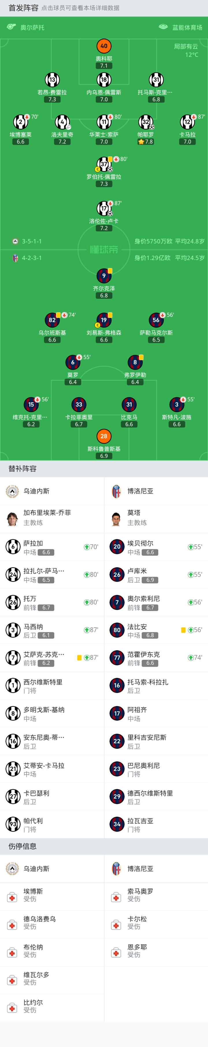 乌迪内斯3-0终结博洛尼亚联赛3连胜,帕耶罗、卢卡建功