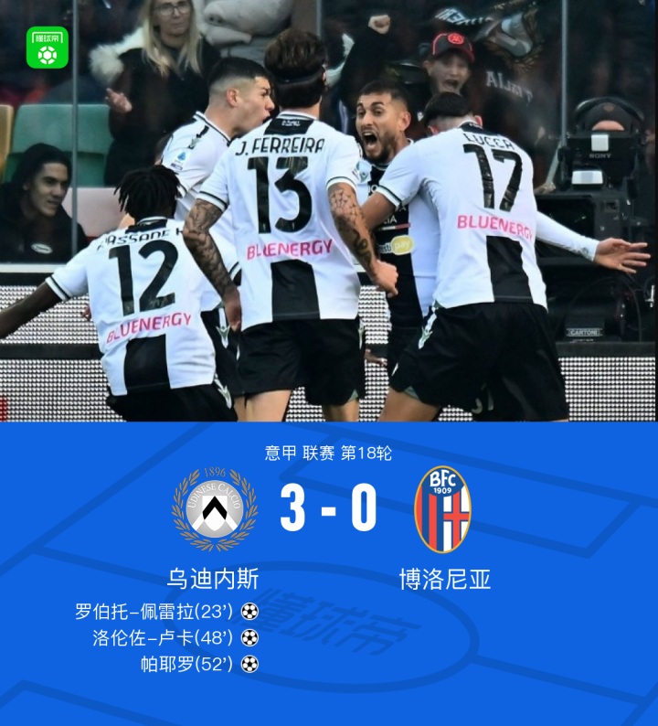北京时间12月30日意甲 联赛 第18轮,乌迪内斯主场对阵博洛尼亚。上半场,埃博莱塞兜射被扑,罗伯托-佩雷拉推射破门。下半场,洛伦佐-卢卡扩大比分,帕耶罗抽射建功,最终,乌迪内斯3-0博洛尼亚。