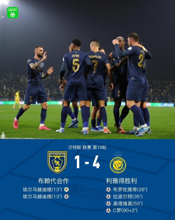 北京时间12月31日沙特联 联赛 第19轮,布赖代合作主场对阵利雅得胜利。阿姆里送点,埃尔马赫迪维点球被扑后自己补射命中。随后,利雅得胜利前场打出精彩配合,塔利斯卡助攻布罗佐维奇推射破门,扳平比分。布罗佐维奇角球开出,拉波尔特头球破门反超比分。下半场,埃尔马赫迪维解围失误,奥塔维奥笑纳大礼扩大比分。比赛最后时刻,C罗接福法纳传球,高高跃起头球破门,打进年度第54球。战罢,最终比分1-4。