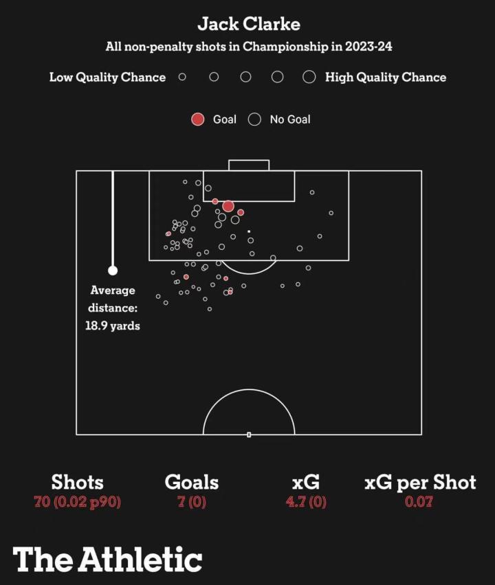然而,克拉克的魅力远不止于他的进球。他是本赛季英冠联赛中被犯规次数最多的球员(60 次,而且还在不断增加),他首发出场 25 次,带球过人次数达到了170 次,仅用半程创下了英冠联赛的新高。克拉克是标准的现代型边锋,能突能传,在左路内切充满爆发力和技巧的兜远角射门是他的标志性进球方式。
