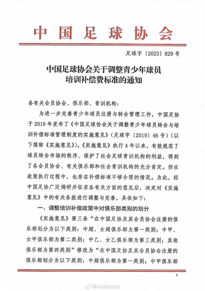 近日,中国足协近日下发了《关于调整青少年球员培训补偿费标准的通知》(足球字[2023]829号)文件,根据市场目前实际情况,大幅降低了青少年球员转会时的青训补偿计算标准。