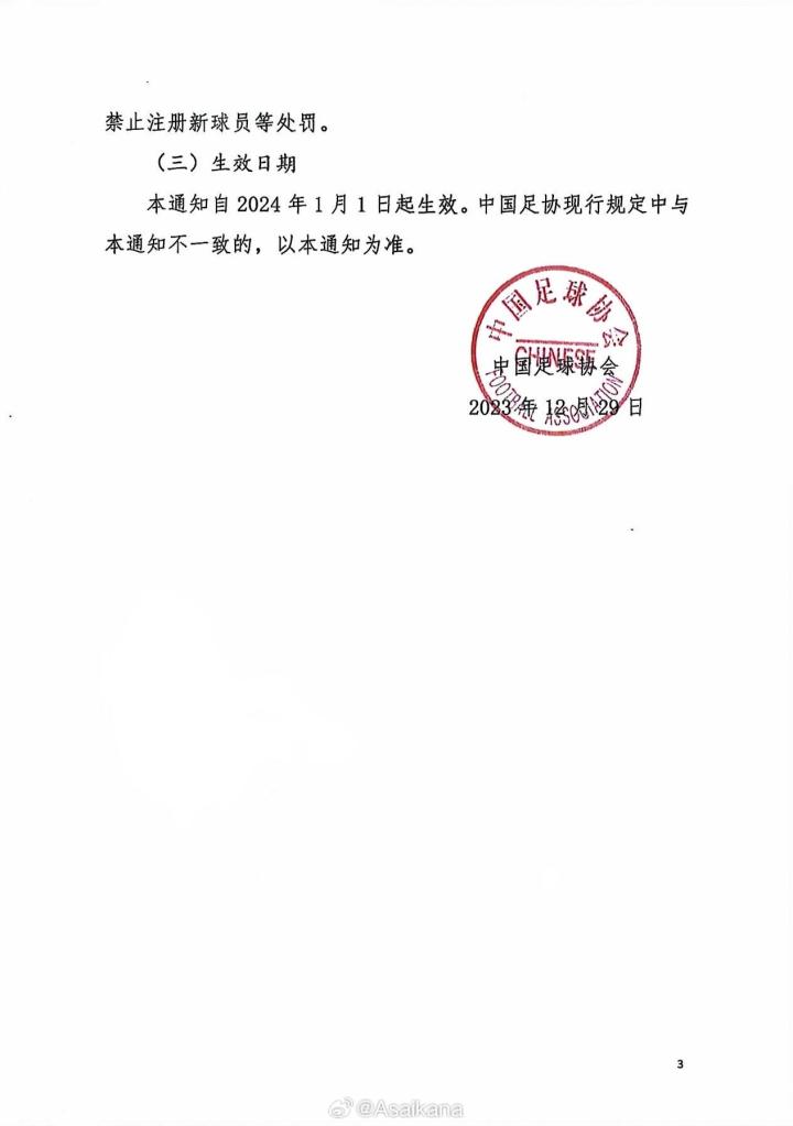 本通知自2024年1月1日起生效。中国足协现行规定中与本通知不一致的,以本通知为准。