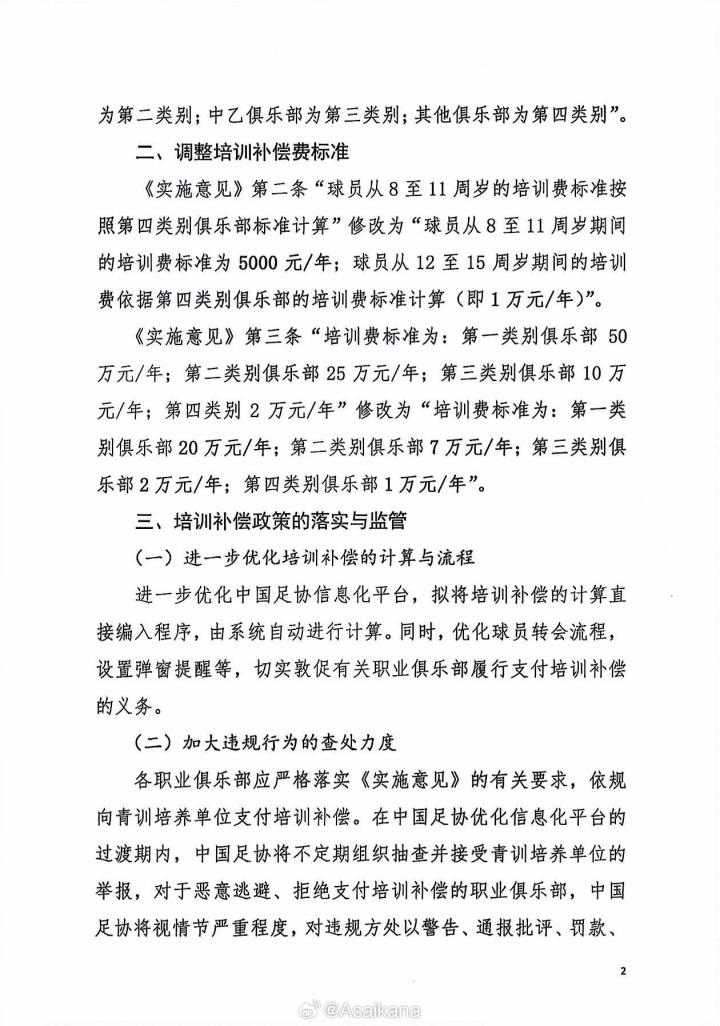 为进一步完善青少年球员注册与转会管理工作,中国足协于2019年发布了《中国足球协会关于调整青少年球员转会与培训补偿标准管理制度的实施意见》(足球字〔2019〕46号)(以下简称《实施意见》)。《实施意见》执行4年以来,有效规范了球员转会市场的秩序、保护了社会足球青训机构的利益,得到了各会员协会、有关俱乐部和社会青训机构的充分肯定。但在政策执行过程中,也存在补偿标准不够合理的情况。为此,经中国足协广泛调研并征求各有关方面的意见后,决定对《实施意见》中的有关条款进行调整与完善,具体如下: