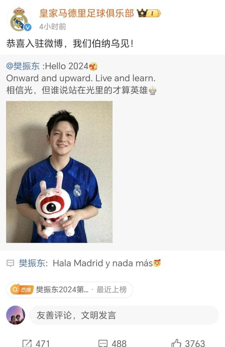 乒坛和足坛梦幻联动!樊振东重返微博,皇马官方转发...天天向上Football @懂球帝2024-01-01 18:18乒坛和足坛梦幻联动!樊振东重返微博,皇马官方转发表示:我们伯纳乌见。 樊振东表示:Hala Madrid y nada más。 樊振东重返微博第一条信息:Hello 2024 Onward and upward. Live and learn. 相信光,但谁说站在光里的才算英雄。展开更多