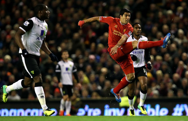 苏亚雷斯在本赛季英超第14轮利物浦主场对阵诺维奇的比赛中独中四元,帮助球队5-1大胜对手。