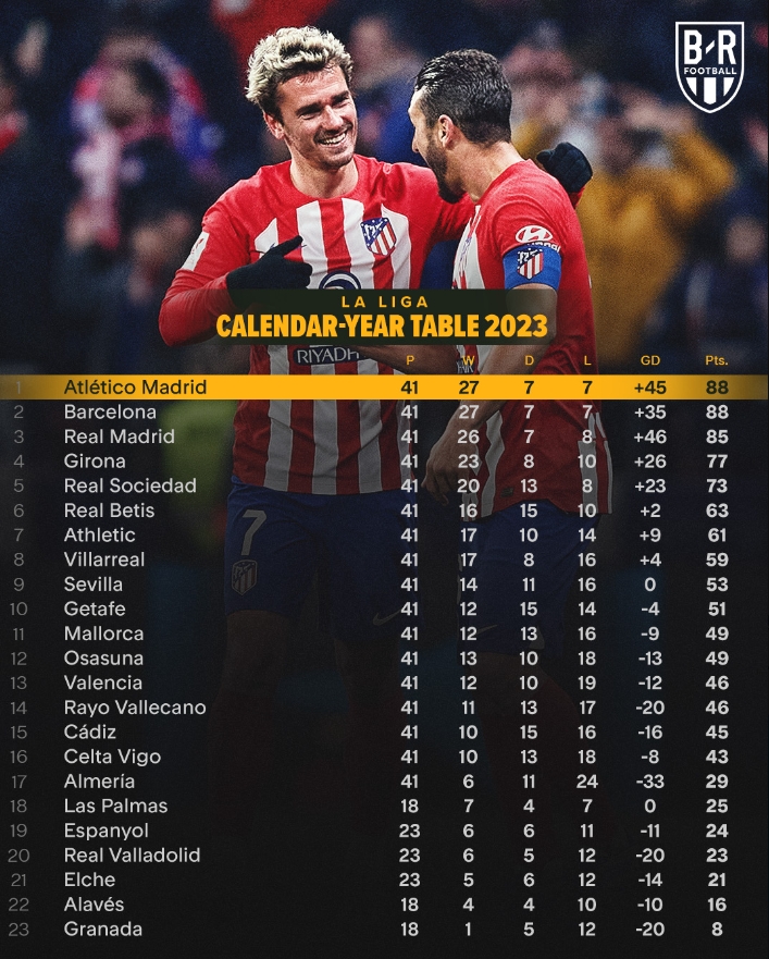 2023自然年西甲积分榜:马竞以净胜球的优势领跑!巴塞罗那、皇马紧随其后!