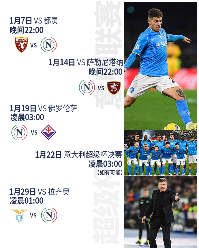 赛程表 | 2024年1月赛程表, 意甲联赛与意...那不勒斯足球俱乐部 @懂球帝2024-01-02 11:21赛程表 | 2024年1月赛程表, 意甲联赛与意大利超级杯两项赛事——那不勒斯期待打满全部五场比赛,争取荣誉与骄傲。展开更多