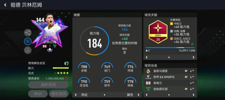 创始俱乐部推出的这张大使之星球员卡基础能力值给到了144,各项数据都接近800,是不折不扣的六边形战士。贝林厄姆的综合能力与实战价值在现役中场里是绝对顶尖的存在。