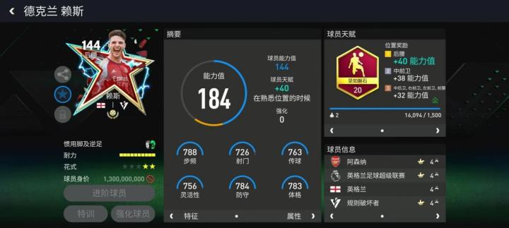 规则破坏者活动中为赖斯推出了一张基础能力值为144的破坏者之星球员卡。数据配置极为华丽,从面板上几乎看不到有任何的短板,搭配坚如磐石天赋之后,他的防守属性进一步提升。