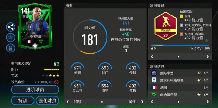 创始俱乐部活动曾经为图拉姆推出过一张初始能力值为141的球员卡。这张卡直到现在都还有极高的性价比,各项接近700的数据,强壮的身体模型与逆天的双速配置,几乎集齐了前锋位置所有的优点。