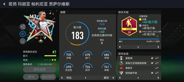 规则破坏者活动为帕里尼亚推出了一张破坏者之星球员卡,基础能力值给到了143,各项防守数据都在750左右,是他在游戏中能力值最高的一张球员卡,也是现役后腰中防守能力最强的一张球员卡。