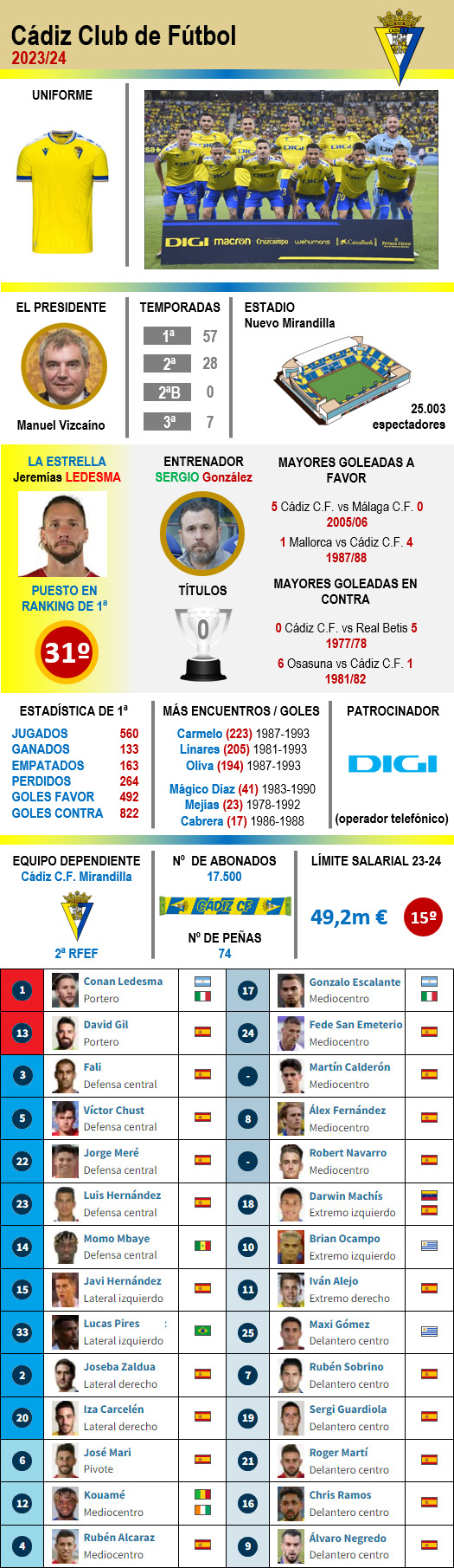 加的斯足球俱乐部(Cádiz Club de Fútbol,SAD),简称为加的斯,是一家位于安达卢西亚加的斯的西班牙职业足球俱乐部。该俱乐部成立于 1910 年,主场比赛地点为Nuevo Mirandilla,可容纳 20,724 名观众,俱乐部目前征战西甲联赛,截止发稿(2021.1.2),俱乐部排名西甲联赛17名。