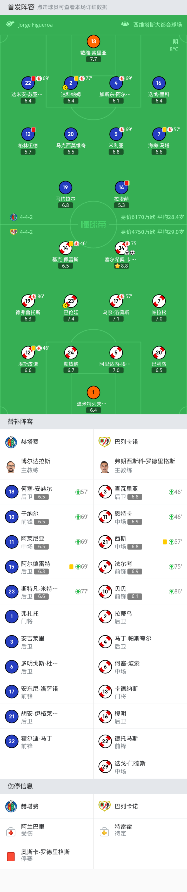 替补:22-德托马斯, 6-何塞-波索, 13-卡德纳斯, 16-穆明, 2-拉蒂乌, 4-马丁-帕斯夸尔, 29-迭戈-门德斯