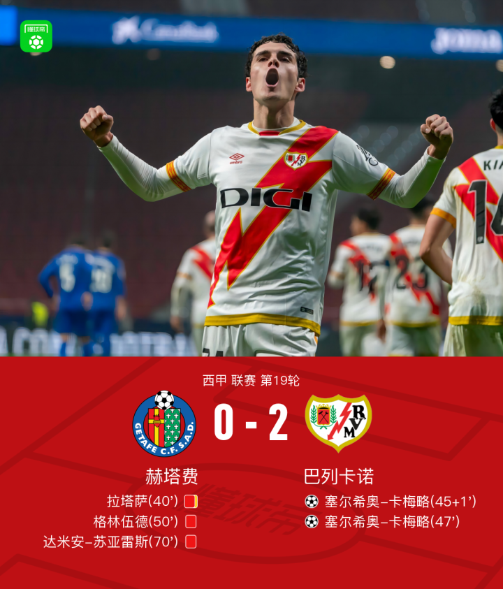 北京时间1月3日西甲 联赛 第19轮,赫塔费对阵巴列卡诺,因赫塔费主场被罚空场,本场比赛在马竞主场西维塔斯大都会球场进行。上半场拉塔萨争顶时肘击犯规,裁判出示第二张黄牌将其罚下,半场补时阶段塞尔希奥-卡梅略门前补射破门。下半场卡梅略突入禁区晃过门将破门完成双响,随后格林伍德抗议判罚对裁判出言不逊,裁判将其直红罚下,之后被换下的达米安-苏亚雷斯对裁判出言不逊,裁判出示红牌。最终巴列卡诺2-0战胜九人赫塔费。