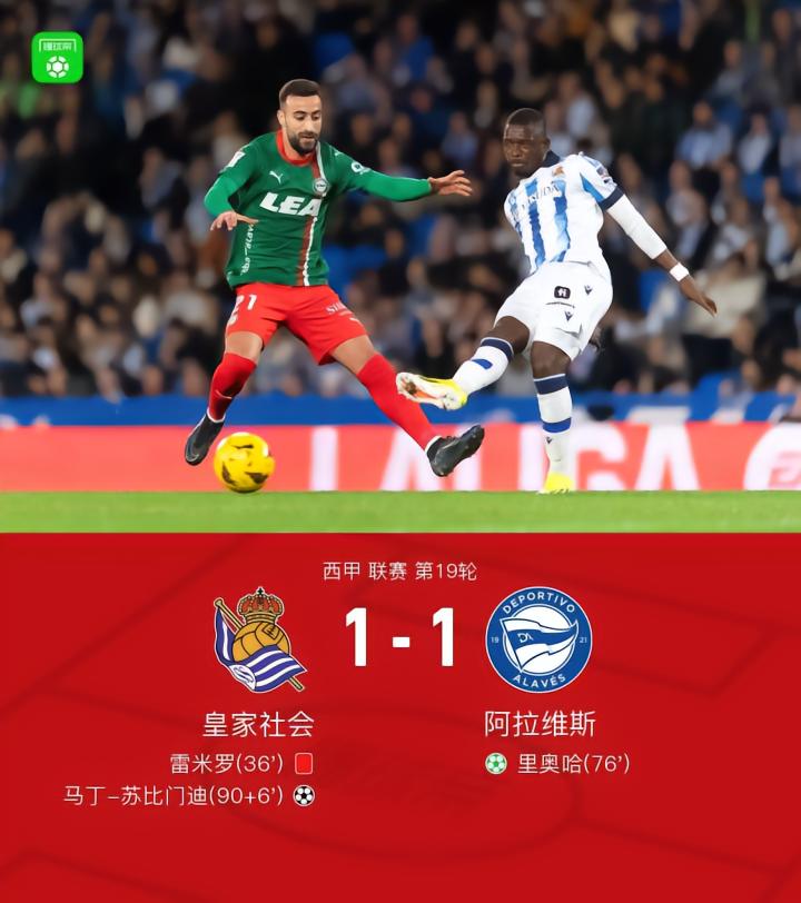 皇家社会1-1阿拉维斯遭4连平,里奥哈点射破僵,苏比门迪绝平