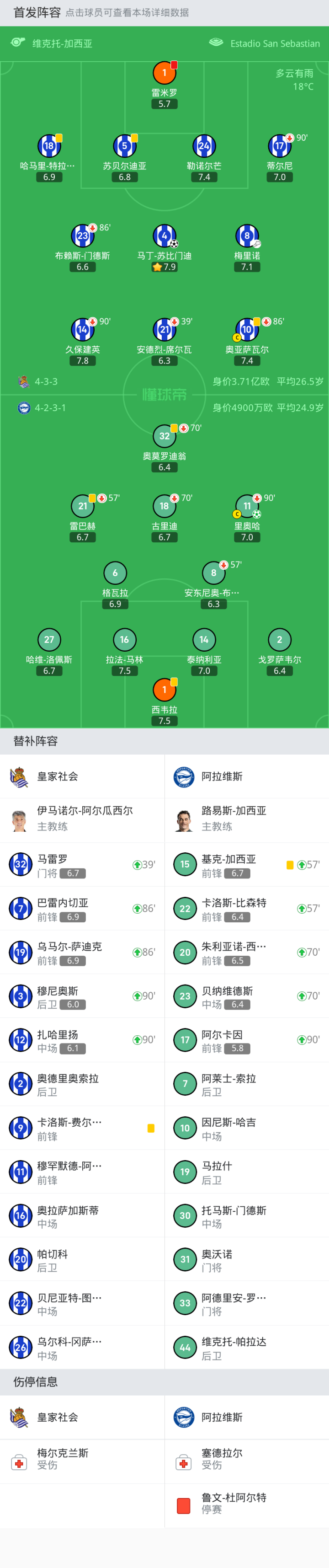 阿拉维斯首发:11-里奥哈, 2-戈罗萨韦尔, 18-古里迪, 1-西韦拉, 6-格瓦拉, 14-泰纳利亚, 8-安东尼奥-布兰科, 27-哈维-洛佩斯, 16-拉法-马林, 21-雷巴赫, 32-奥莫罗迪翁