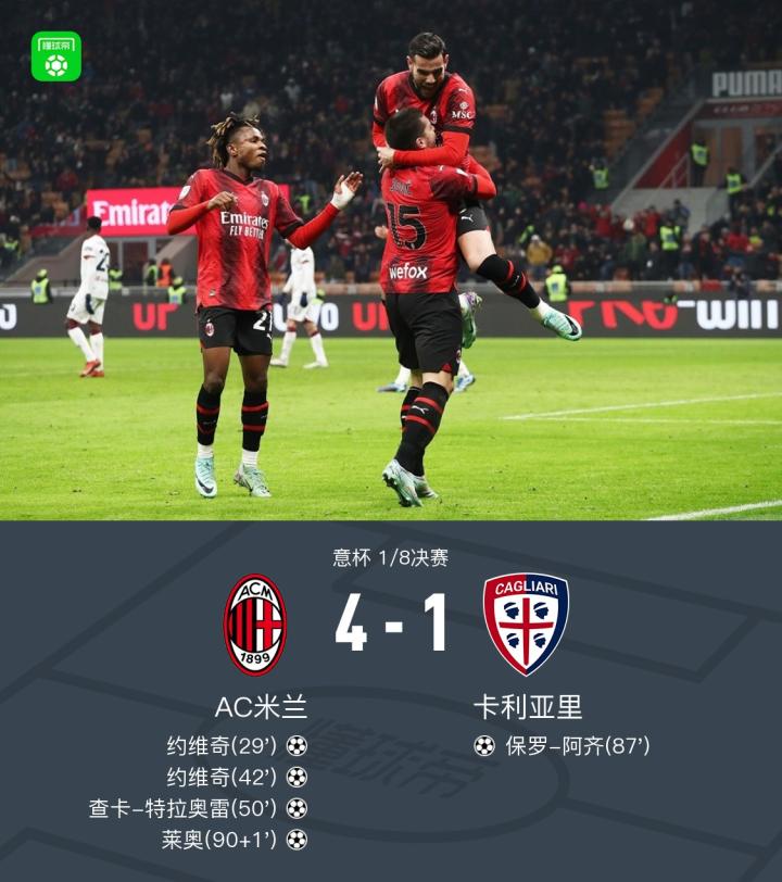 北京时间1月3日意杯 1/8决赛,AC米兰主场对阵卡利亚里。上半场,佩塔尼亚近距离头球被扑,约维奇推射被拉杜诺维奇倒地扑出,特奥两度助攻约维奇破门完成梅开二度;下半场,特拉奥雷打进一线队首球,莱奥替补登场后接连尝试打门均未果,西米奇传球被断后阿齐远射入网扳回一球,补时阶段普利希奇助攻莱奥攻破大门。最终比分4-1。