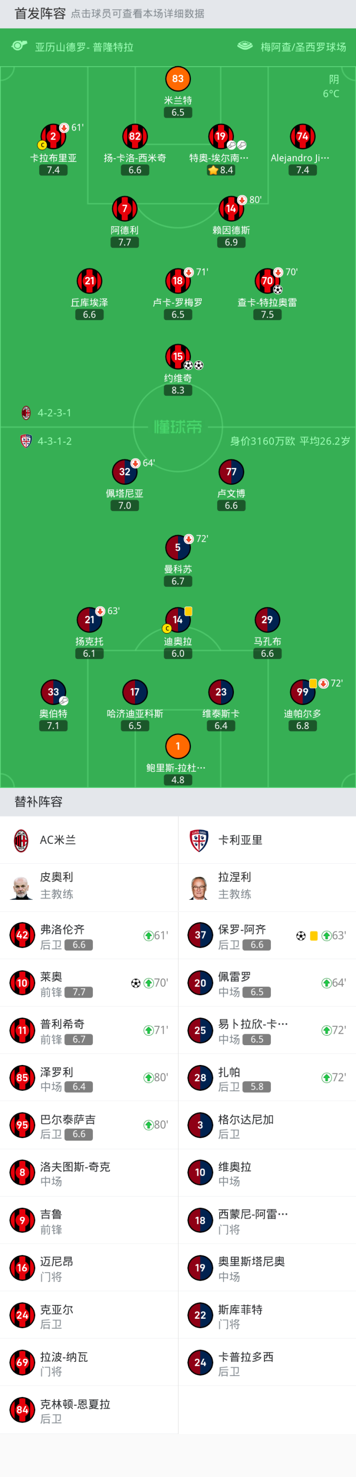 AC米兰首发:83-米兰特, 2-卡拉布里亚, 15-约维奇, 19-特奥-埃尔南德斯, 21-丘库埃泽, 7-阿德利, 14-赖因德斯, 18-卢卡-罗梅罗, 70-查卡-特拉奥雷, 82-扬-卡洛-西米奇, 74-Alejandro Jiménez