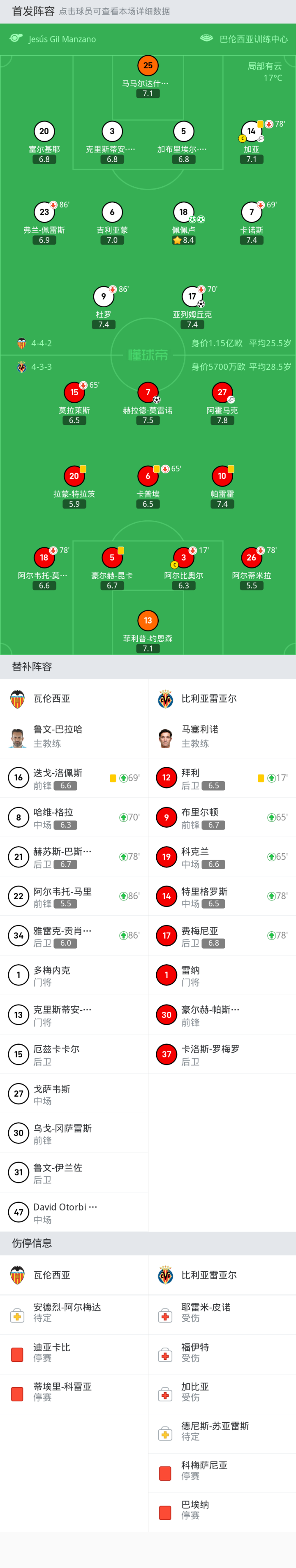 比利亚雷亚尔首发:3-阿尔比奥尔, 6-卡普埃, 10-帕雷霍, 7-赫拉德-莫雷诺, 18-阿尔韦托-莫雷诺, 15-莫拉莱斯, 5-豪尔赫-昆卡, 26-阿尔蒂米拉, 13-菲利普-约恩森, 20-拉蒙-特拉茨, 27-阿霍马克