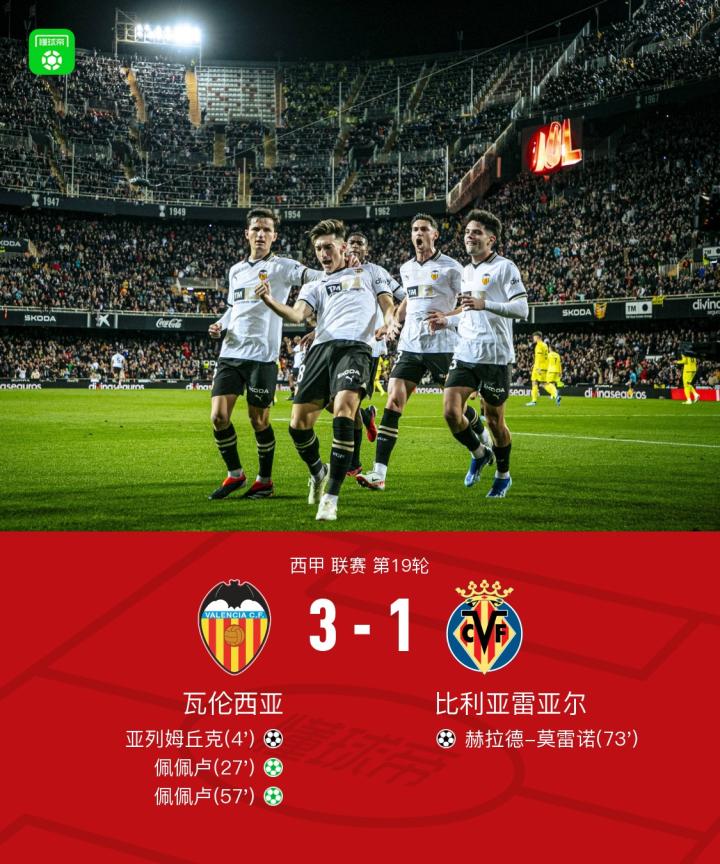 北京时间1月3日西甲 联赛 第19轮,瓦伦西亚主场对阵比利亚雷亚尔。上半场,加亚倒三角回做助攻亚列姆丘克推射破门,约恩森出球失误被断后将功补过挡出亚列姆丘克打门,莫雷诺凌空抽射被马马尔达什维利奋力扑出,杜罗造点后佩佩卢主罚命中,莫拉莱斯破门被判越位进球无效;下半场,阿尔蒂米拉手球送点后佩佩卢再次罚进梅开二度,阿霍马克戏耍加亚后助攻莫雷诺包抄打进,佩佩卢任意球打门被约恩森神勇扑出。最终比分3-1。