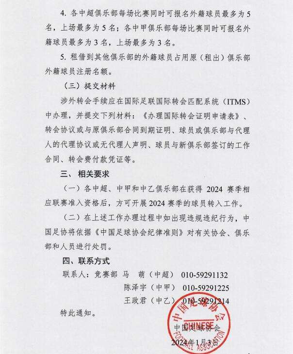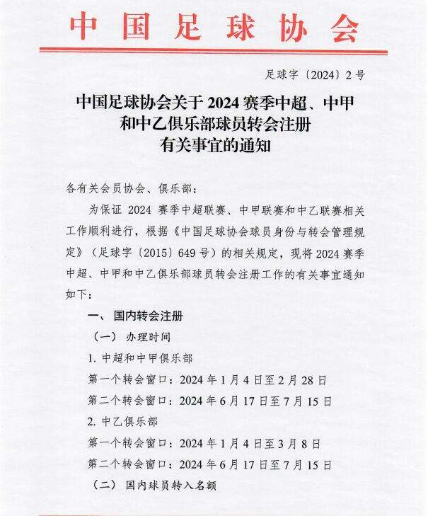 足协官方公布新赛季外援政策和转会窗日期。外援政策...崔神马文KING @懂球帝2024-01-03 10:30足协官方公布新赛季外援政策和转会窗日期。 外援政策总结 中超球队可注册7名外援,每场可最多报名5名外援,上场最多5名外援;国内球员转会将不限额。 联赛转会窗: 中超和中甲: 第一个转会窗:2024年1月4号至2月28号 第二个转会窗:2024年6月17号至7月15号 中乙: 第一个转会窗:2024年1月4号至3月8号 第二个转会窗:2024年6月17号至7月15号展开更多