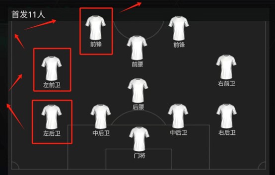由于强势球员基本在左路,所以在实战中的进攻也以左路球员为主导,充分发挥左路的突破优势。