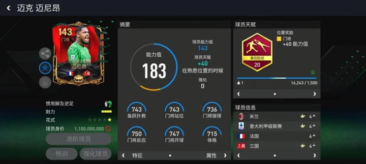 迈尼昂是整个三国将系列截至目前推出的唯一一张门将位置球员卡,配备143的基础能力值与最后防线天赋,各项数据都是750左右,足可见其地位。