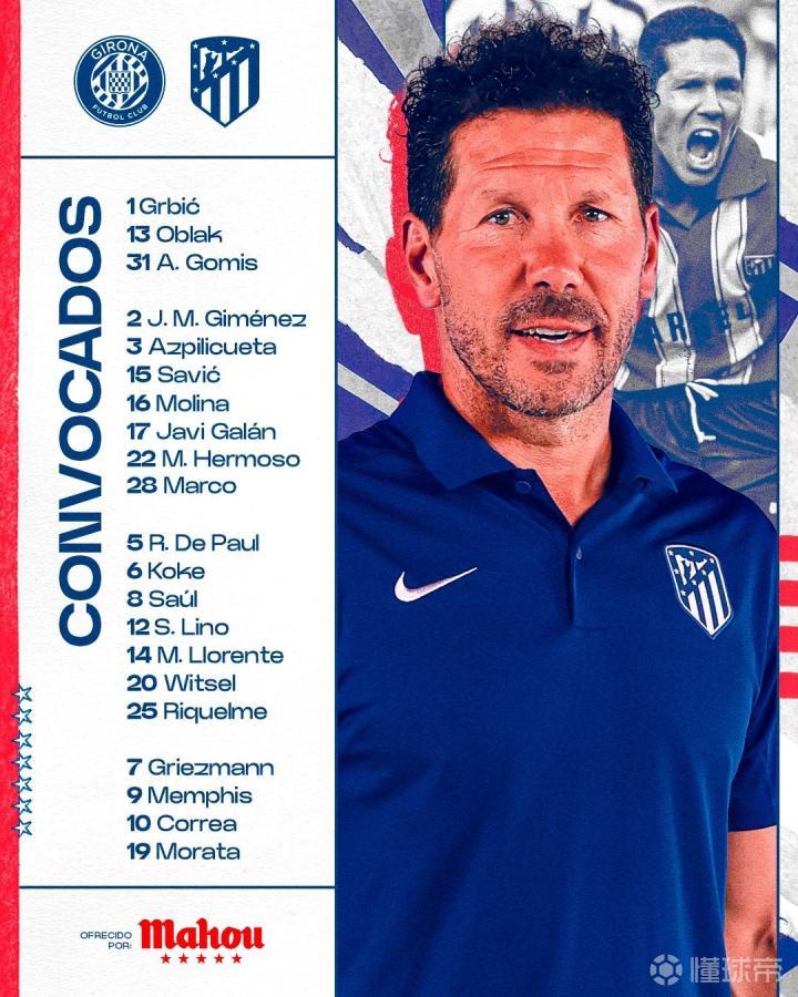 马竞公布对阵赫罗纳大名单:格列兹曼领衔
