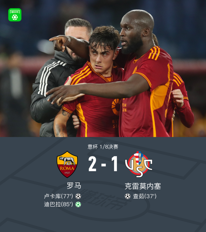 罗马2-1克雷莫内塞晋级意杯8强,卢卡库破门,迪巴拉点射绝杀