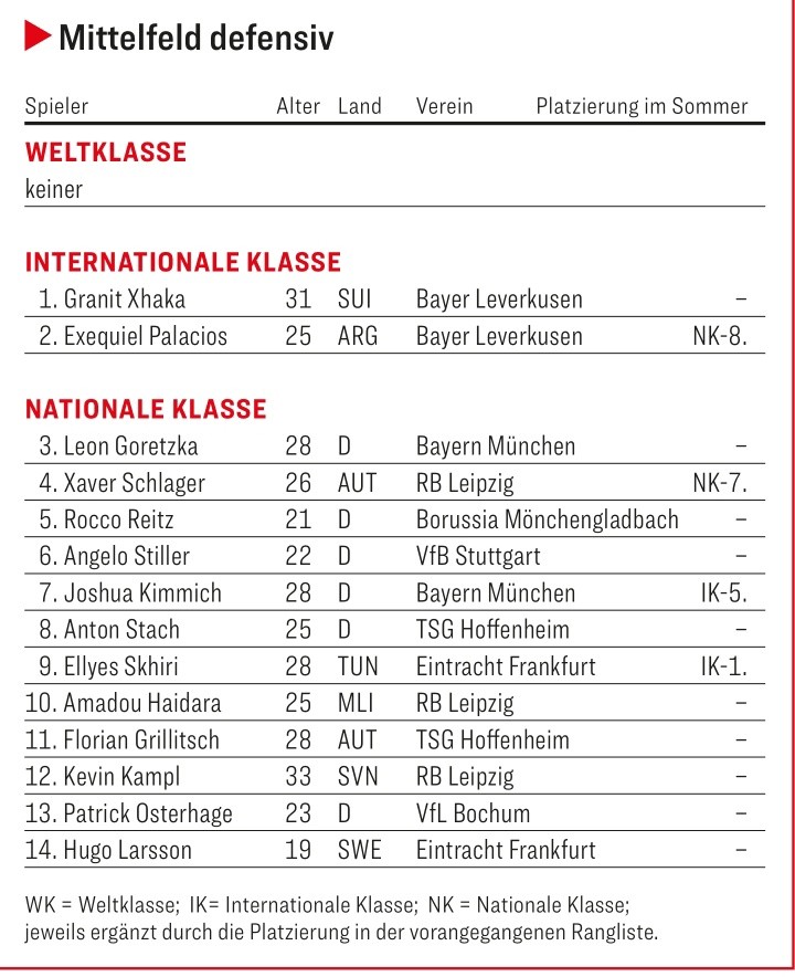 本周德国足球媒体《踢球者》杂志公布了最新的评级榜单。《踢球者》的评级榜单每半个赛季公布一次,评级根据球员们最近半个赛季在德甲、德国杯、欧战以及国家队的表现综合得出。在防守型中场评级中,勒沃库森中场扎卡和帕拉西奥斯排名前二,领衔洲际级,拜仁中场格雷茨卡排在第三,位列国脚级。