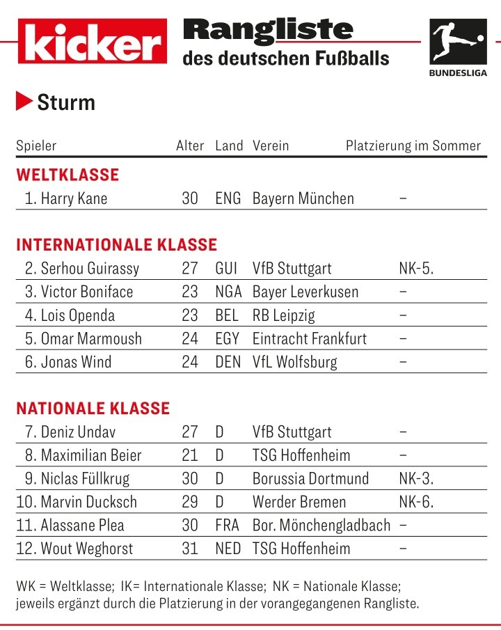 本周德国足球媒体《踢球者》杂志公布了最新的评级榜单。《踢球者》的评级榜单每半个赛季公布一次,评级根据球员们最近半个赛季在德甲、德国杯、欧战以及国家队的表现综合得出。在德甲2023-24赛季上半程中锋评级中,拜仁中锋凯恩位列世界级,当之无愧。斯图加特中锋吉拉西和勒沃库森中锋博尼费斯分列第二和第三,位列洲际级。