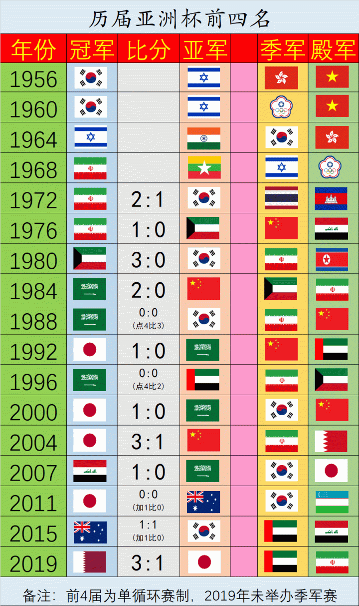 亚洲杯冠军排名:日本4次冠军第一,韩国陷64年冠...日不落的爱恋 @懂球帝2024-01-04 18:13亚洲杯冠军排名:日本4次冠军第一,韩国陷64年冠军荒,中国2次亚军 值得一提的是,中国总共6次杀进亚洲杯四强,仅次于10次的韩国的与9次的伊朗,再加上中国曾参加过世界杯,因此把国足称为亚洲“老牌劲旅”并不为过。展开更多
