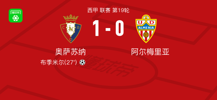 北京时间1月5日西甲 联赛 第19轮,奥萨苏纳主场对阵阿尔梅里亚。奥萨苏纳布季米尔破门。阿尔梅里亚。最终比分1-0。