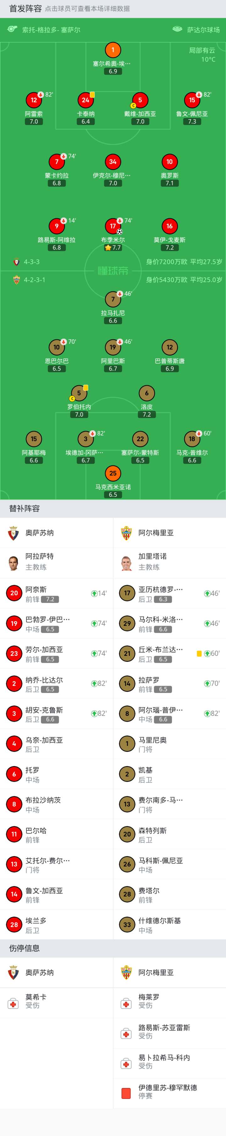 奥萨苏纳首发:17-布季米尔, 9-路易斯-阿维拉, 16-莫伊-戈麦斯, 5-戴维-加西亚, 15-鲁文-佩尼亚, 1-塞尔希奥-埃雷拉, 24-卡泰纳, 12-阿雷索, 7-蒙卡约拉, 10-奥罗斯, 34-伊克尔-穆尼奥斯