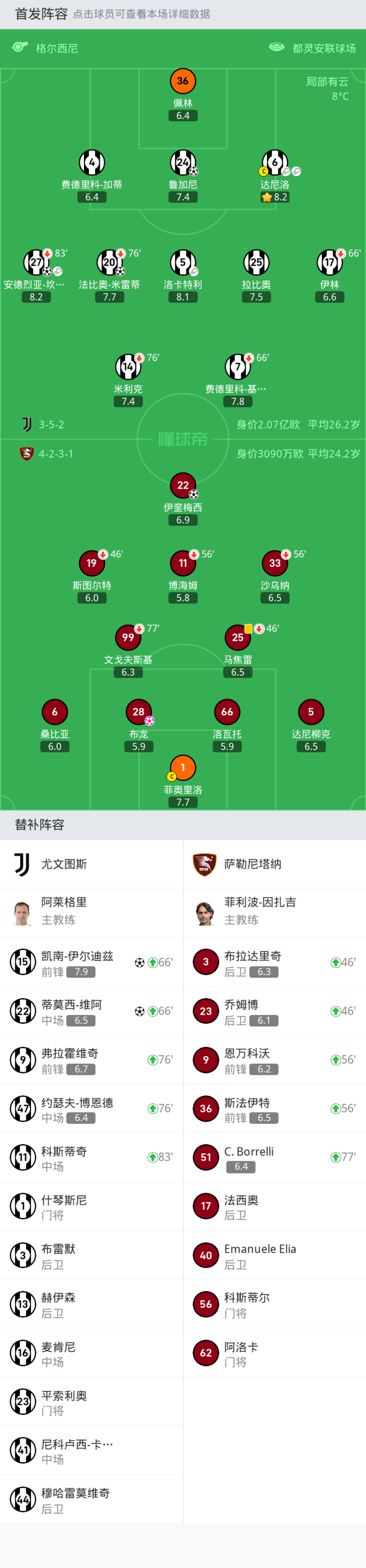 替换下场:76'14-米利克, 66'7-费德里科-基耶萨, 83'27-安德烈亚-坎比亚索, 66'17-伊林, 76'20-法比奥-米雷蒂